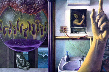 レオナルド・ダ・ヴィンチの素描や作品の一部を見つめていると、頭の中でそれらの絵が動き出し新しい物語が始まる。そのイメージを記録しようとスケッチをするのだが、それは私の絵の中に収まりきらず、私の日常生活の様々な場面に現れる。私はそれを捉えようと、日常生活の場面と組み合わさったレオナルド作品の断片を描く。これらの作品は、レオナルドのイメージと私のイメージが対話した記録である。